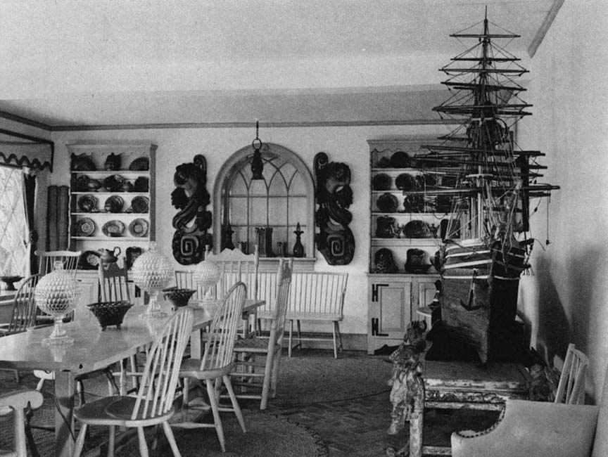 | Here is where we enter, where Beauport began its growth around panelling from the William Cogswell House in nearby Essex. The notable trumpet-leg cabinet (left) houses Chinese Export porcelain made for a Portuguese noble, from Mrs. McCann's collection. A harlequin hooked rug softens the waxed-brick floor. |