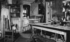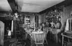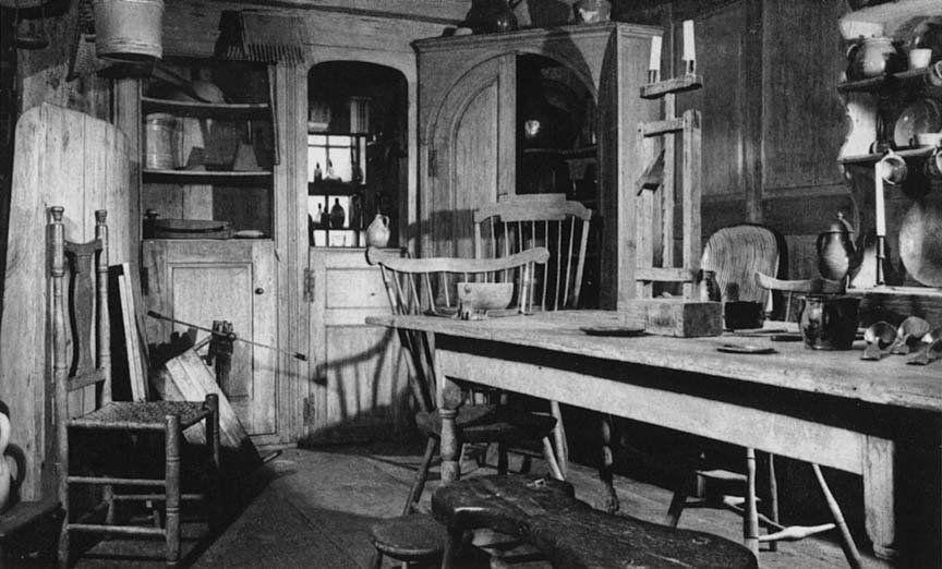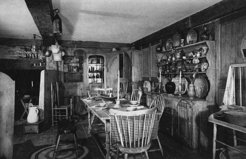 The tall fireside settle (left) curves inward to trap warmth and toast shins. Oak posts and beams, pine walls, and chimney brick are the room's basic materials. Deep in the fireplace are ovens and warming-ledges. On a crane hangs a noble iron kettle. |
