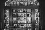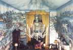 | Mrs. McCann transformed this extraordinary room from its next-earlier incarnation (still earlier it had been a chapel), into the opulent Georgian-Chippendale drawing room you see here. It is "keyed" by a unique hand-painted Chinese paper imported, but unused, for the mansion of Lewis Morris, the 'Signer.' It lay fresh and hidden in the attic of a Marblehead house for over a century. The furniture today is of English pedigree. Carved and pierced gold screens serve as rails for the twin galleries at either end. The ceiling curves in-and-upward to the rooftree, as in a pagoda. The chandelier is of fairly unbelievable Waterford. |