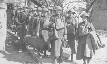 The St. Mihiel drive came on and the hut was turned over to the hospital. The supplies were taken to a dugout and the canteen kept up there. Then the military authorities insisted that the girls should leave town, but the girls refused to go, begging, "Don't drive us away. We know we shall be needed!" The Staff-Captain came down and took some of the girls away, but left two in the canteen, and others in the hospital.