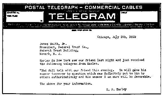 On the morning of July 5th I received the following telegram from Harlan, in which the words "our friend" refers to Doctor Wilson and "other" to Senator Smith: