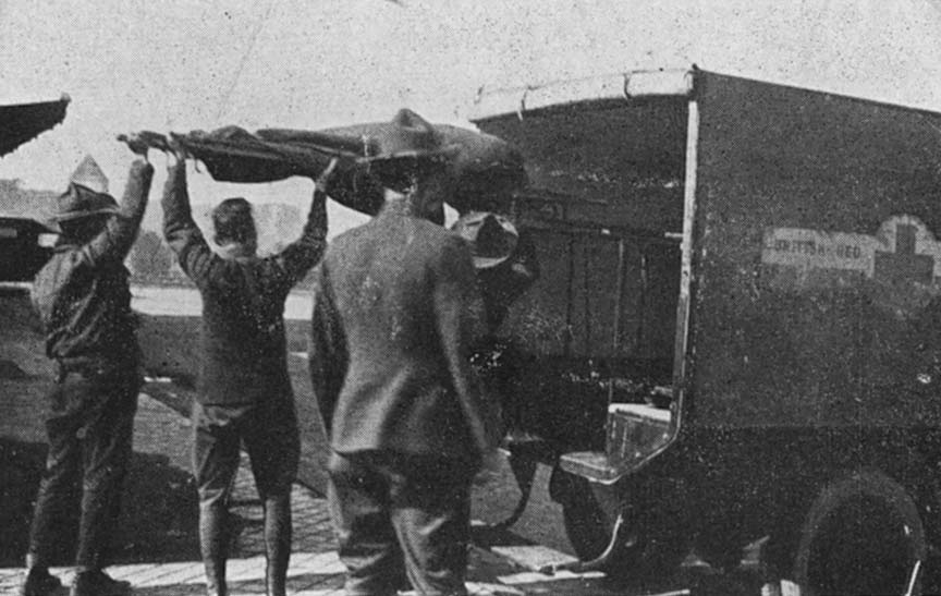 Now the tent flap opens and two brancardiers appear, bearing between them a stretcher upon which lies a limp figure covered with a dirty blanket. A gray-green sleeve dangles from the stretcher and shows your first passenger is a German. He is slid into place and by this time your second passenger is ready. He is a giant Senegalese with a punctured lung. Your third man is a sous-officier whose right leg has just been amputated. He has been given a shot of morphine and his eyes are glazed in stupor. The third stretcher is shot home, the tail board put up and the rear curtain clamped down. Over these roads we can take no more, so we are ready for the start.
