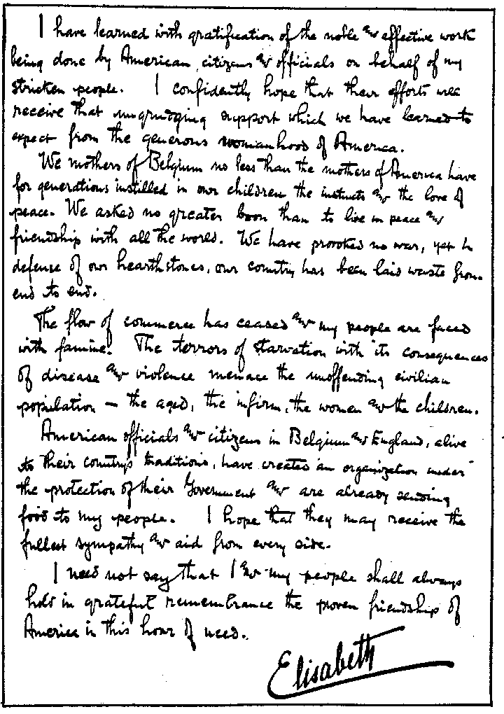 Last night Mr. Gahan got a pass and was admitted to see Miss Cavell shortly before she was taken out and shot. He said she was calm and prepared and faced the ordeal without a tremor. She was a tiny thing that looked as though she could be blown away with a breath, but she had a great spirit. She told Mr. Gahan that soldiers had come to her and asked to be helped to the frontier; that knowing the risks they ran and the risks she took, she had helped them. She said she had nothing to regret, no complaint to make, and that if she had it all to do over again, she would change nothing. And most pathetic of all was her statement that she thanked God for the six weeks she had passed in prison---the nearest approach to rest she had known for years.