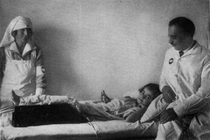 As a preventive measure, practically the entire population in infected areas was given anti-typhoid inoculations. Notices were posted and announcements made by the town crier regarding the time and place chosen for this work. Sometimes the village bell, which usually tolled for ceremonies or calamities, was rung. When the people assembled, which they always did promptly, to hear what new troubles impended, the official speaker explained that the Germans were not coming, but that typhoid fever in a virulent form had appeared in the community; that it was possible to prevent this disease by anti-typhoid inoculations, and that American women physicians were present, and prepared to give these treatments.