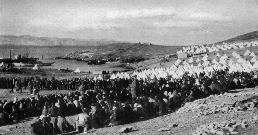THE AMERICAN QUARANTINE STATION ON MACRONISSI ISLAND, GREECE, FEEDING SIX THOUSAND GREEK REFUGEES FROM TREBIZOND, BLACK SEA PORT, WHO HAVE JUST ARRIVED BY STEAMER.