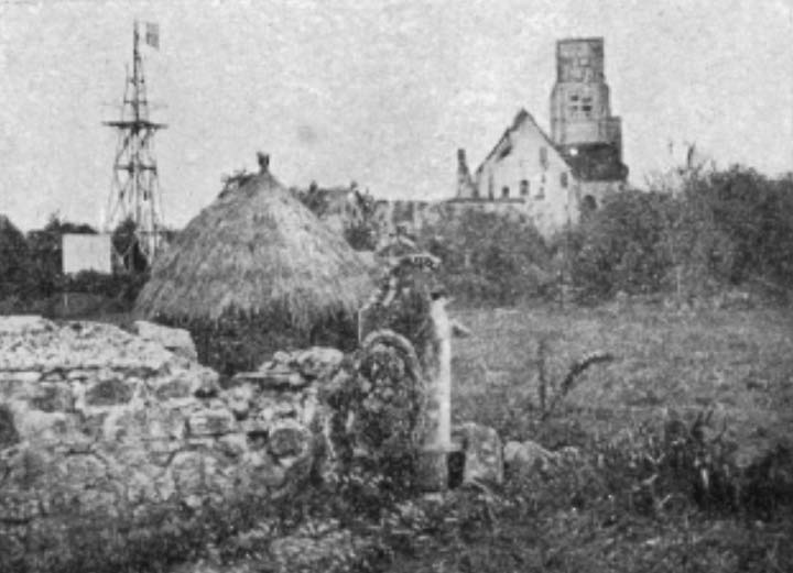 En prenant à droite la route qui touche l'église, on rencontre à 200 m. le cimetière que le bombardement a bouleversé. C'est par l'une des brèches qu'est prise la photo ci-dessous. Le moulin élévateur d'eau, à la gauche de la vue, a été criblé de balles.