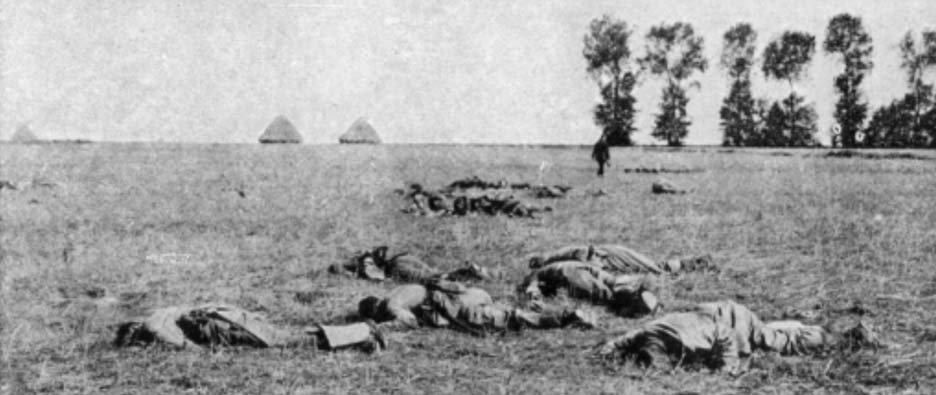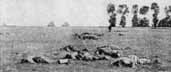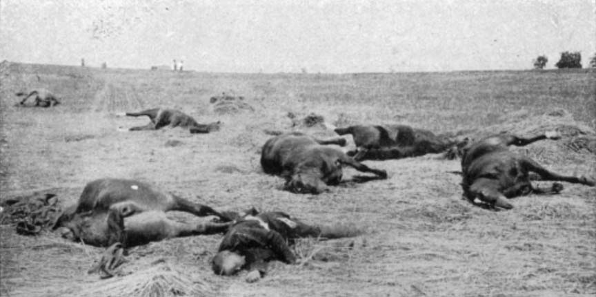Ce dernier bourg n'a pas été compris dans l'itinéraire bien qu'il ait joué un rôle important dans la manoeuvre ultime de débordement de l'aile gauche française tentée par von Klück. La route pavée qui y conduit est mauvaise et les chemins permettant de regagner l'itinéraire sont très cahoteux. Nous donnons ci-dessous la vue d'un coin de ce champ de bataille. Elle donne une idée de la grande plaine qui s'étend de Betz à Nanteuil, où les 7e et 61e divisions françaises résistèrent avec une énergie désespérée aux attaques furieuses du IVe corps allemand. Les chevaux morts qui apparaissent sur la photo appartenaient à une batterie française. Les 75, à découvert, soutenaient l'effort des fantassins presque jusqu'au contact de l'ennemi.