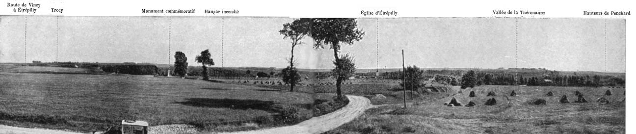Pour se rendre au point d'où est prise la vue ci-dessous, prendre le chemin de terre qui s'embranche sur la route de Vincy à Étrépilly, entre le monument commémoratif el le hangar incendié. C'est ce chemin qu'on voit traverser le panorama, au centre. Le touriste se trouve à l'extrémité sud de la position Vincy-Étrépilly, sur l'emplacement d'une batterie allemande qui fut fortement éprouvée par les 75 français. A l'arrière-plan, ou aperçoit le plateau de Trocy, séparé de la route par une dépression au fond de laquelle coule un affluent de la Thérouanne. Sur ce plateau de Trocy où la suite de l'itinéraire conduira le lecteur, les Allemands avaient installé une artillerie puissante composée de batteries lourdes et légères qui balayaient tout le champ de bataille depuis la ferme de Nogeon jusqu'à Barcy, en passant par Puisieux et Marcilly. Au delà de la vallée de la Thérouanne s'étend, au sud d'Étrépilly, la position dont les détails apparaissent dans le panorama "B" (p. 94). La vue s'étend jusqu'aux hauteurs boisées de Penchard qui s'estompent à l'horizon.