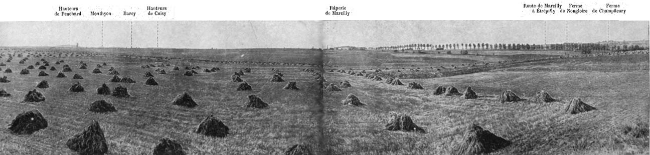 Sur la croupe de terrain où se trouve l'observateur, eurent lieu des combats acharnés lors des attaques sur Étrépilly. Le 350e d'infanterie avait, une première fois, pénétré dans le village dans la matinée du 7 en suivant la vallée de la Thérouanne, mais, vivement contre-attaqué, avait dû se replier. Il revint à la charge à la nuit et s'éleva des bords de la rivière jusqu'au plateau. Il fut accueilli par les feux d'une section de mitrailleuses sur laquelle deux compagnies s'élancèrent à la baïonnette, Deux pièces furent prises. Les troupes françaises se maintinrent jusqu'à 10 heures du soir, mais durent finalement, devant les renforts qui affluèrent, redescendre la pente et repasser sur la rive droite de la Thérouanne.