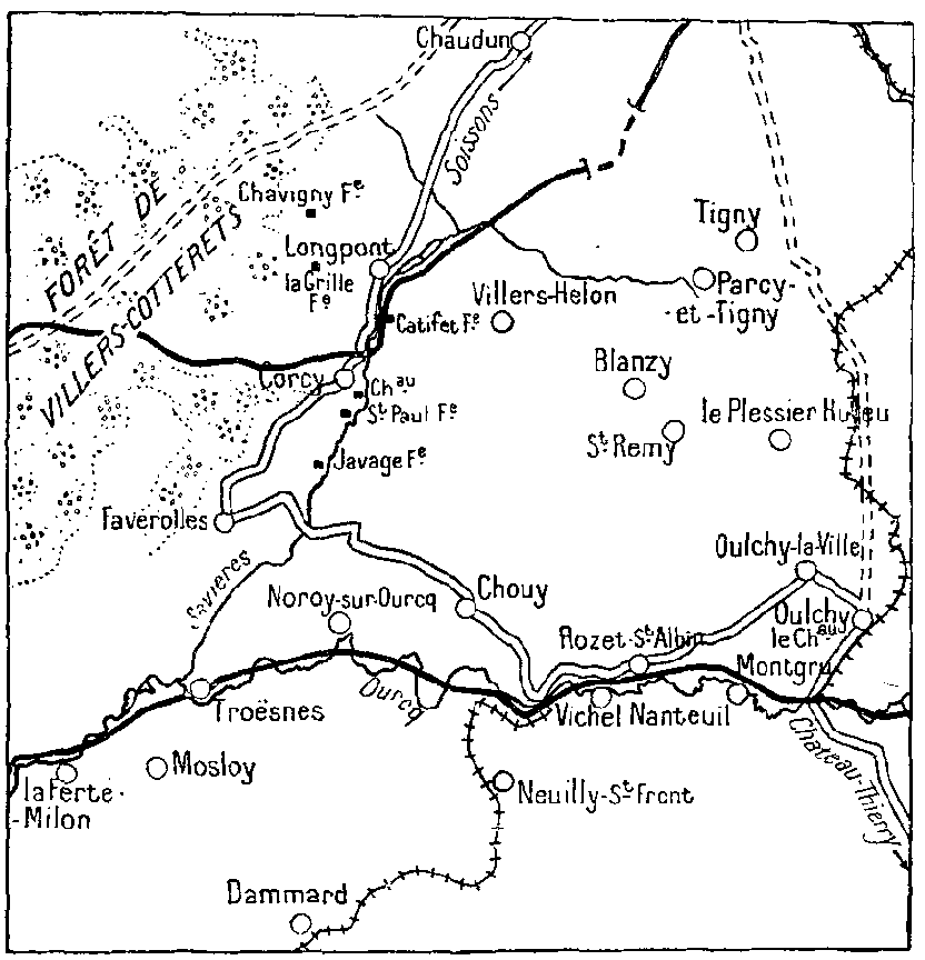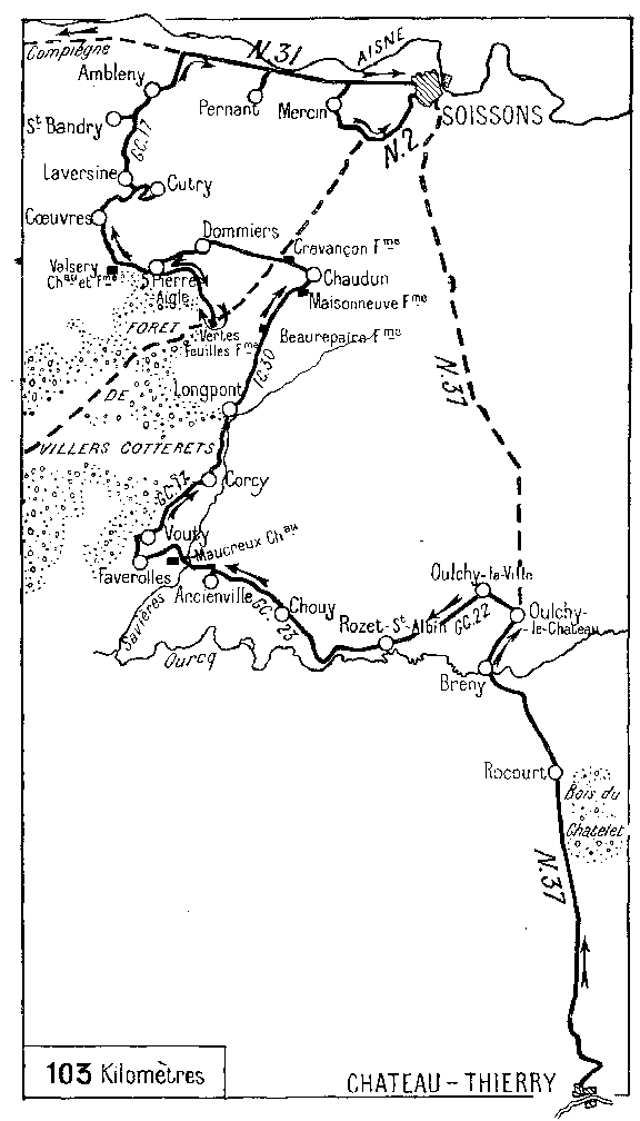 Le tracé adopté permettra de suivre le développement de la bataille pour le dégagement de la poche de Château-Thierry (Voir p. 19 à 29).