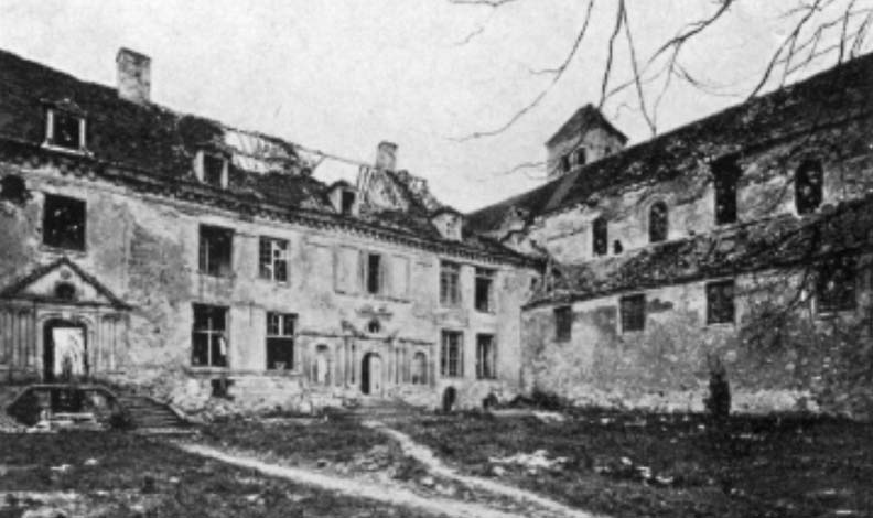 Revenir au G. C. 23 où l'on tournera à gauche. Les bois rencontrés sont dévastés. On passe sur la SAVIÈRES et on aperçoit à gauche, sur un monticule, le CHATEAU DE MAUCREUX, à demi détruit par les obus (photo ci-dessous).