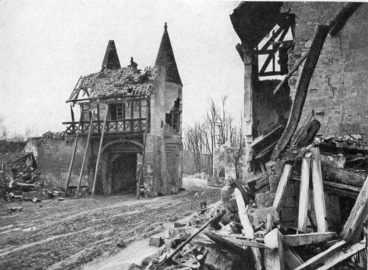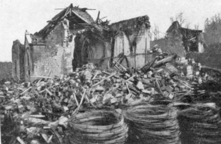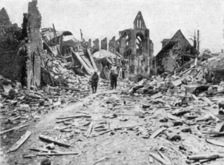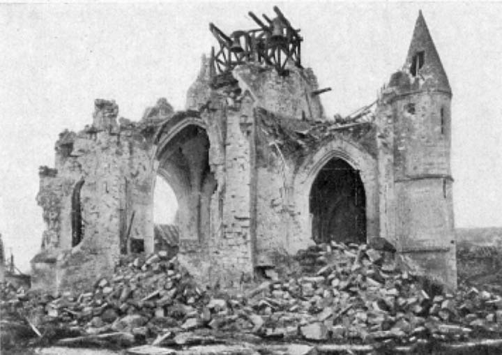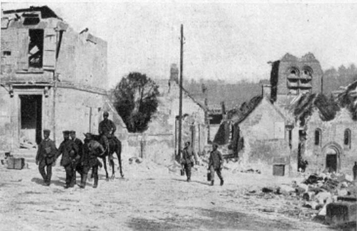 Depuis cette date, les chars d'assaut qui y figurent ont été enlevés. On arrive au village de Dommiers entièrement ruiné.