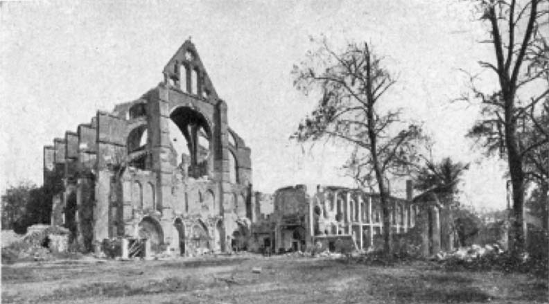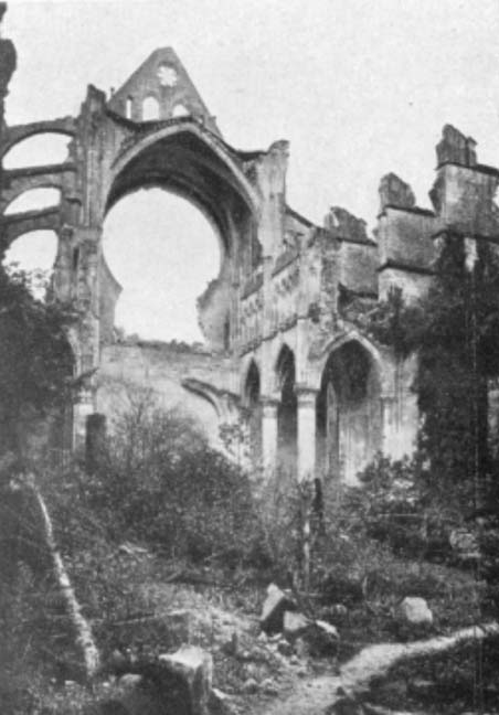 Des murailles, dont l'abbaye s'entoura pour se protéger contre les bandes qui battaient les routes et les campagnes, il est resté une porte fortifiée du XIIIe siècle, surmontée de quatre tourelles à flèches de pierre (photo ci-contre). Sur la place se dressent les ruines d'une magnifique et considérable église ogivale, dont les fondements furent jetés, vers 1131, par le comte de Crespy; elle fut consacrée, en 1227, en présence du roi Saint-Louis et de sa mère. La belle façade à pignon, les murs de la nef avec leurs lourds contreforts, leurs légers arcs-boutants, sont debout, ainsi que le transept ; de l'abside et des chapelles absidales, il ne reste plus que des murs et des colonnes (photos pages 86 et 87).