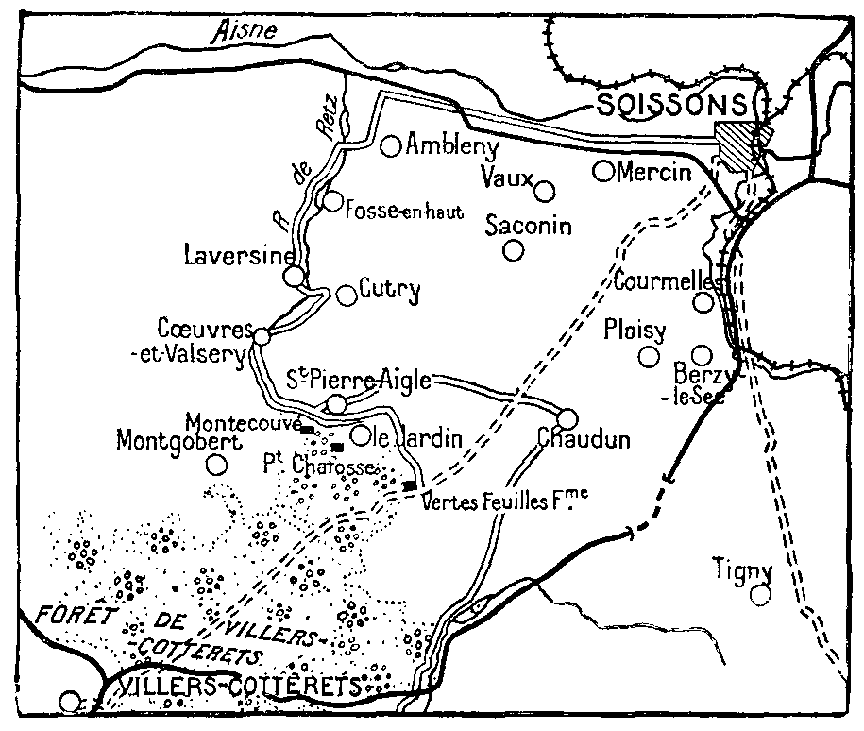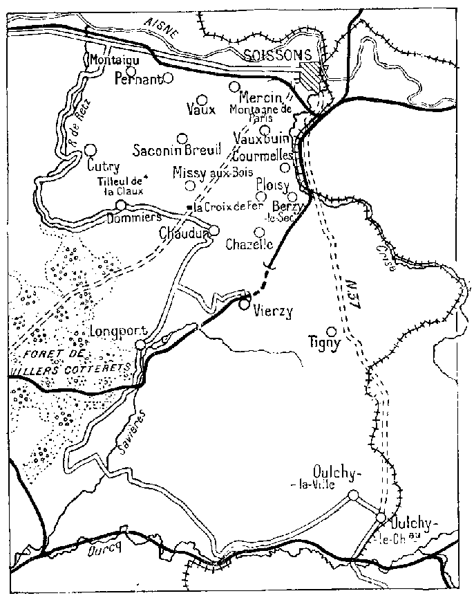 Les 29 et 30 mai, pendant que les troupes françaises se cramponnaient aux débouchés sud-ouest de SOISSONS débordé par les corps von François et von Larisch, les 6e D. et 6e D.R. bavaroise franchissent la Crise, la route de SOISSONS à OULCHY et s'emparent de CHAUDUN et VIERZY, après de longs combats au cours desquels des unités françaises de chars d'assaut légers, à peine débarquées et précédant zouaves et tirailleurs de la division marocaine, poussent des charges furieuses contre les ravins de PLOIZY et de CHAZELLE. Le 1er juin, les contre-attaques rejettent l'ennemi sur la Crise. CHAUDUN et VIERZY, pris et reperdus à plusieurs reprises, restent finalement aux Français. Le 3, les Allemands faisant donner toutes leurs réserves disponibles, s'emparent de PERNANT, après une lutte opiniâtre, reprennent CHAUDUN, VIERZY, dépassent MISSY-AUX-BOIS, LE TILLEUL DE LA CLAUX, LA CROIX DE FER et atteignent la ligne : DOMMIERS-MONTAIGU. Les 12 et 13 juin, une nouvelle offensive les porte au delà de DOMMIERS et de CUTRY, vers le RU-DE-RETZ.