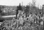 Dans les talus de la route étaient creusés des abris individuels. Un peu plus loin, près d'une habitation démolie, se voyaient des monceaux de bobines de câbles téléphoniques brûlés, des caissons, des moteurs incendiés.