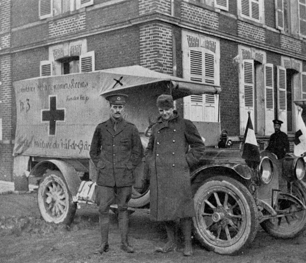 I have been doing quite a bit of work on old silver and Mr. M------ helps me all I want. It grieves me a lot not to have started working sooner, but if this job comes out o.k. it's well worth waiting for. The men go out with the car as near the trenches as they dare, pick up the wounded who are taken back eight kilometers or so to the Chateau, where the doctors fix them up temporarily and send them on to the base hospitals. Most of the cars are Packards. There are four of them, three doctors, six nurses, ten chauffeurs, cooks, bottle washers, etc. My visit with the G------ L------'s did me no end of good, and I was surprised to find how much French I had forgotten.