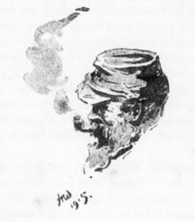 I was just commencing a little drawing of a soldier this afternoon, when a shell fell about fifty yards from us, killing three men and wounding several others. A small fragment from the exploding shell even left its mark upon my paper. Beyond turning his head for a casual glance, my soldier model remained immovable. I feel bound to admit that it was merely from a sense of shame on my part that I pretended to continue my work.