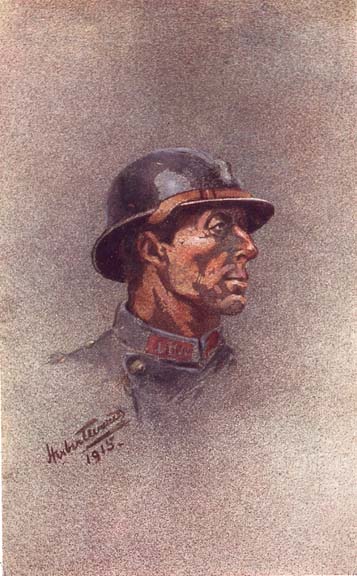 The Chasseurs Alpins Corps to whom our convoy as attached are popularly known as 'The Blue Devils.' The Devil part of their nickname is in flattering allusion to, their valour; the adjective refers to the dark blue colour of their uniforms. They display an almost religious observance in the fulfilment of their vow, indicated by the motto of their corps, 'Never to be taken alive.' The corps is recruited from the mountain country of France the men are remarkable for their sturdy physique (they are mostly men of medium height) and for their tenacious courage. They are accustomed to hardship and fatigue, they live on simple fare and by tradition are deeply imbued with antagonism to the Germans. They are silent men. Their square-set faces seem to speak of successful struggle against the mighty forces of mountain dangers; their strong backs and their frank manners. harmonise well with the brave deeds for which they are world famous.