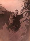 A sketch I once made in a trench at dawn, reminds me that I have seen rugged men, hardened by many months of exposure and peril, watching with appreciative eyes the glorious beauties of daybreak. I know how deeply they are moved by nature's grandeur, because I have had occasion more than once to read the letters of some of these fine French soldiers, written under shell and rifle fire, describing, for instance, in simple picturesque language to their women-folk at home the delicate silvery effects of colour-flooding, which herald the rising of the sun. This profound love of beauty is characteristic of their race, and the soldier inhabiting those living tombs would rather tell of the beauty he has seen in nature than of what he has known of strife and suffering. Here again we meet with that ever-present quality of contrast. Here is a man who at one moment would be capable of calling your attention to the warm tones of the distant snow-clad mountains, and the very next moment would sail in to batter out the brains of his enemy or to give away his own life willingly, without a second thought.