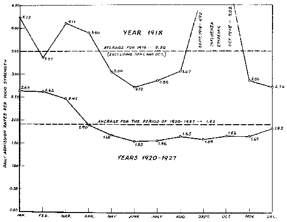 Daily increase in the number of disease and nonbattle injury patients in hospitals and quarters in the United States, 1925 to 1927. |