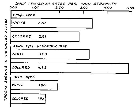 Daily admission rates to hospital and quarters from diseases and nonbattle injuries per 1,000 strength of white and colored troops by color, serving in the United States at different periods. |