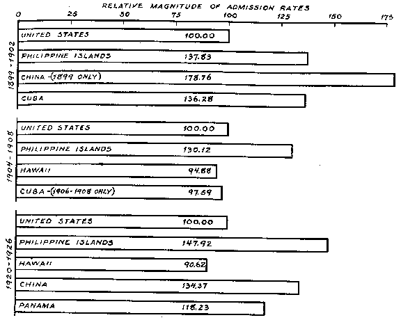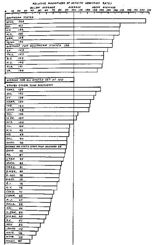 Relative magnitude of admission rates to hospital and quarters from diseases and nonbattle injuries among white men by nativity (native state), serving in the United States and Europe from April 1, 1917 through December 1919. |
