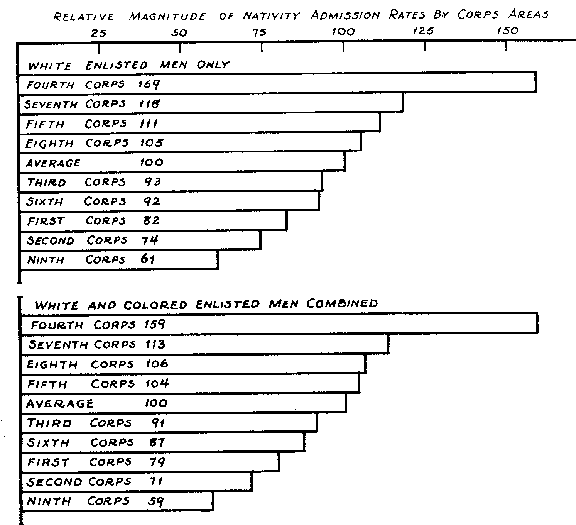 Relative magnitude of admission rates to hospital and quarters from diseases and nonbattle injuries by nativity (native state), arranged by Corps, Areas. among white troops. and also among white and colored troops combined, who were serving in the United States and Europe from April 1. 1917 through December 1919. |