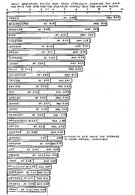 Daily admission rates to hospital and quarters from diseases and nonbattle injuries per 1,000 strength, American troops in thirty large camps during 1918, excluding September and October. Also the maximum rate averaged for my one month in each camp, again excluding September and October. |