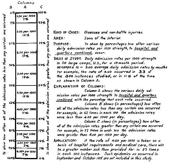 Relative frequency of daily admission rates from diseases and nonbattle injuries to hospital only 1 per 1,000 strength in 30 large camps in the United States during 1918, exclusive of September and October. |