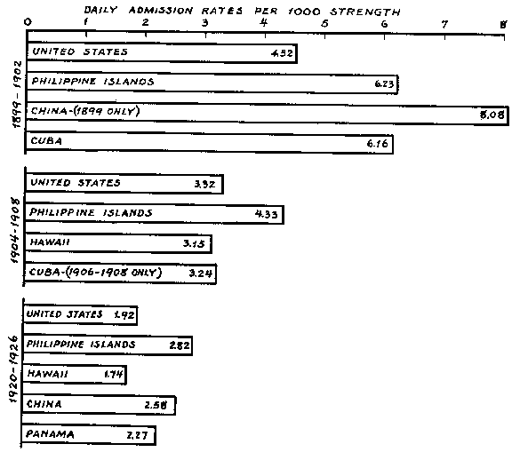 Daily admission rates to hospital and quarters from diseases and non battle injuries per 1,000 strength American troops in different countries at different periods. |