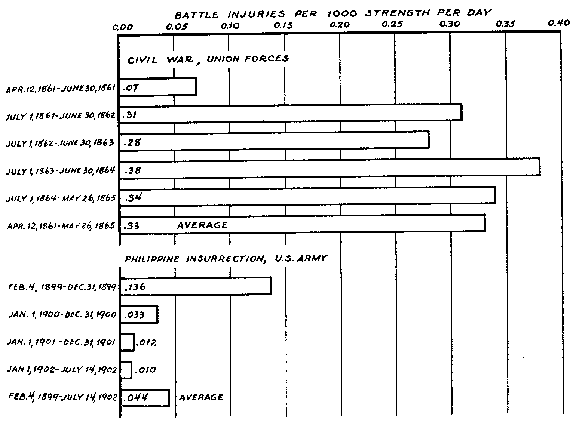 Daily admission rates from battle injuries per 1,000 men in the Union Army during the Civil War: and also in the United States Army in the Philippine Islands during the Philippine Insurrection. |