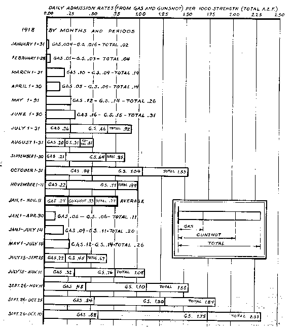 Daily admission rates from gas a and gunshot missiles separately and combined, per 1,000 men in the total American Expeditionary Forces by months and also by periods. |
