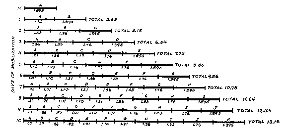 Showing how the total number of patients from disease and nonbattle injuries in the Zone of the Interior increase on each of ten days after mobilization begins. |
