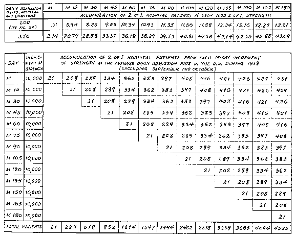 A method of computing the number of hospital patients in a Zone of the Interior command which is increasing 10,000 each 15 days, when the daily admission rate to hospital and quarters combined is 3.50 per 1,000, as it was in the United States in 1918 (excluding September and Oct.). |