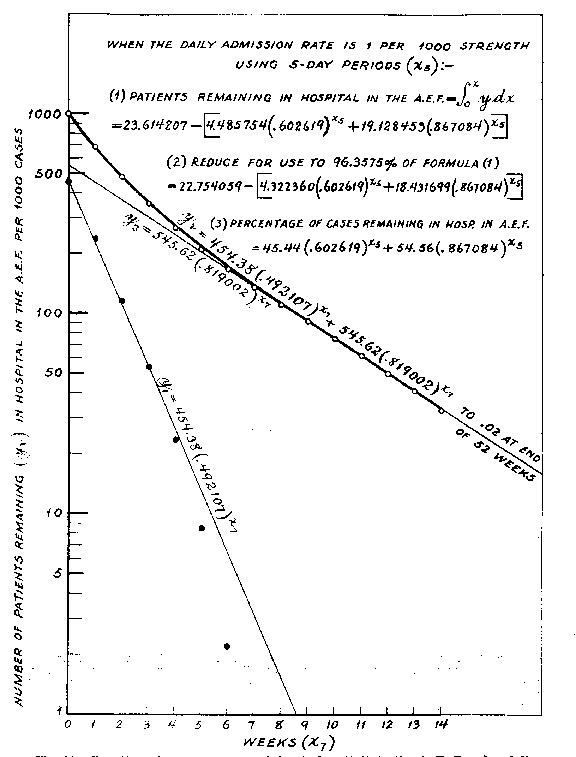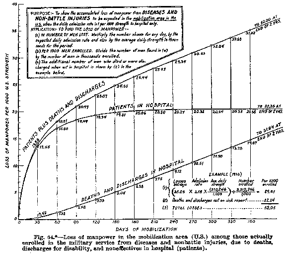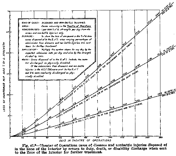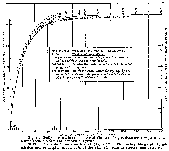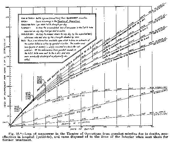 Method of computing for a command in the Theater of Operations the hospital patients to be treated in the Theater of Operations when: (a) There is an increasing strength; (b) admissions from both battle and nonbattle causes; (c) and certain percentages are sent to the Zone of the Interior for further treatment. |