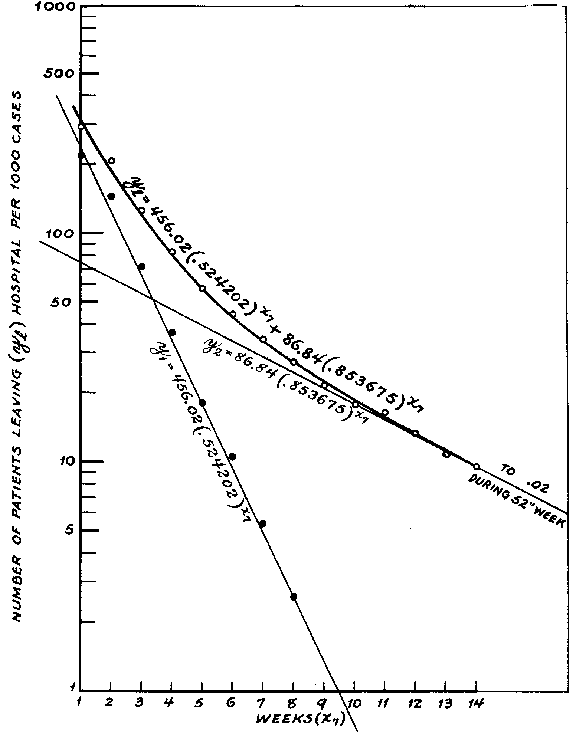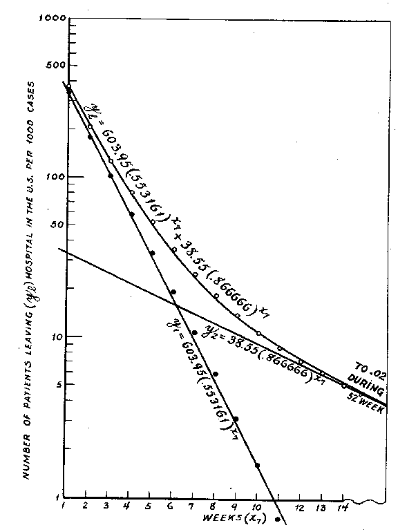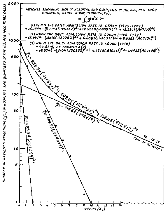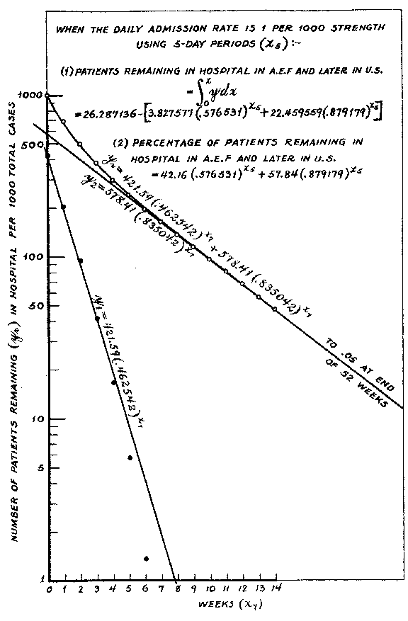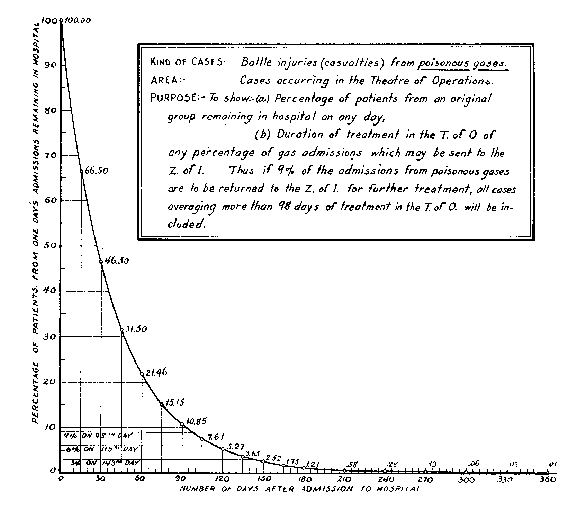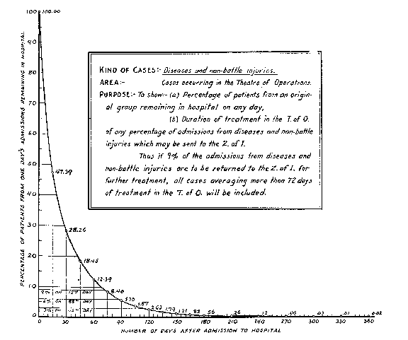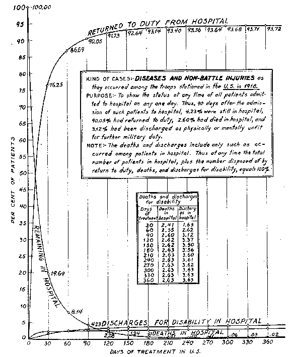 Duration of treatment of disease and nonbattle injury patients admitted to hospital in the United States in 1918 who ultimately died or were discharged for disability. |