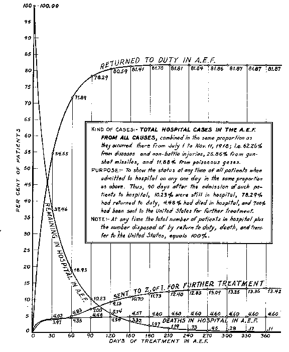 Duration of treatment (leaving hospital) in the American Expeditionary Forces only of disease and nonbattle injury cases which occurred there in 1918. |