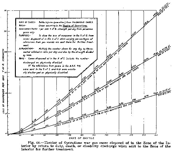 Loss of manpower in the Theater of Operations from war (poisonous) gases due to deaths, noneffectives in hospital (patients), and cases disposed of in the Zone of the Interior when sent there for further treatment. |