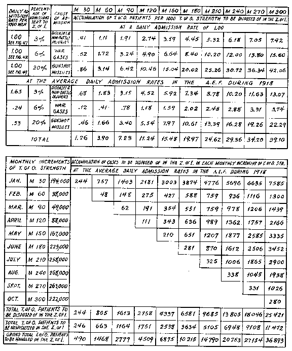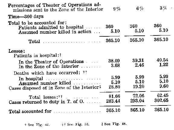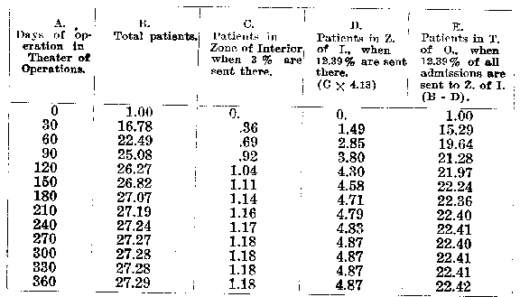 Method of computing the Theater of Operations hospital patients to be treated in the Zone of the Interior when certain percentages of patients are sent there from a command in the Theater of Operations, where there is an increasing strength, and where there are admissions from both battle and nonbattle causes with the same rates as there were in the American Expeditionary Forces in 1918. |