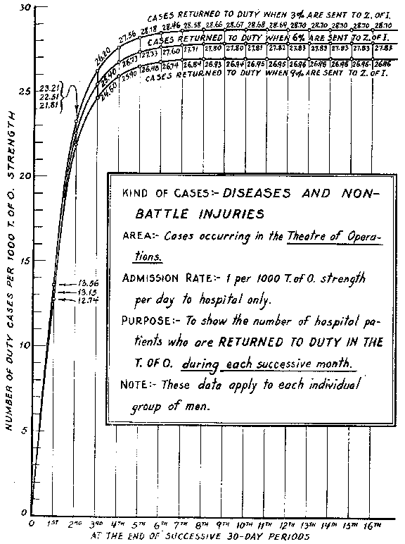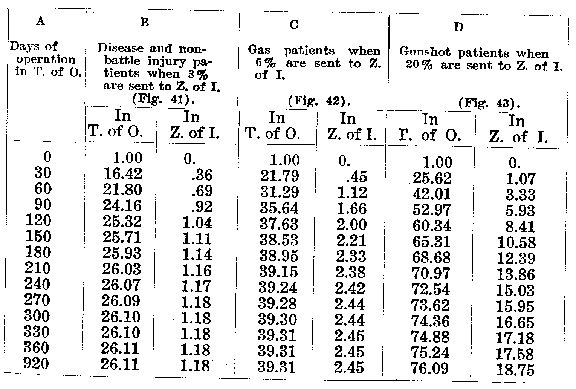 A. Method of computing the Theater of Operations hospital patients to be disposed of in the Zone of the Interior when certain percentages of patients are sent there from a command in the Theater of Operations where there is an increasing strength and where there are admissions from both battle and nonbattle causes at a constant rate B. The total Theater of Operations patients to be hospitalized in the Zone of the Interior C. The grand total Theater of Operations patients to be handled in the Zone of the Interior. |