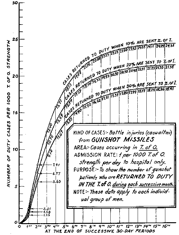 Method of computing the losses to be expected in the Theater of Operations in a command in which there is an increasing strength; where there are admissions from both battle and nonbattle causes; and also when certain percentages of the patients are sent to the Zone of the Interior. |
