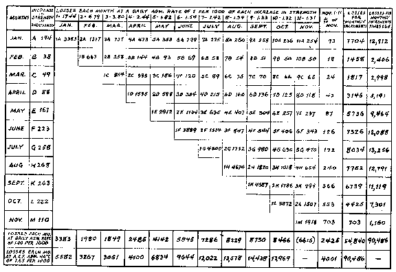 Losses per 1000 men in any one group of them by months of service in the Theater of Operation-. when the daily admission rates to hospital per 1000 total strength are approximately the same as occurred in the American Expeditionary Forces, from July I to Nov. 11, 1918, (excluding the influenza epidemic) |