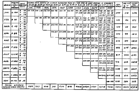 Losses from diseases and nonbattle injuries by months under approximately the same conditions as occurred in the American Expeditionary Forces where there was a material increase in the strength each month, and where the constant average daily admission rate to hospital only from these cases was 1.65 per 1,000 American Expeditionary Forces strength. |