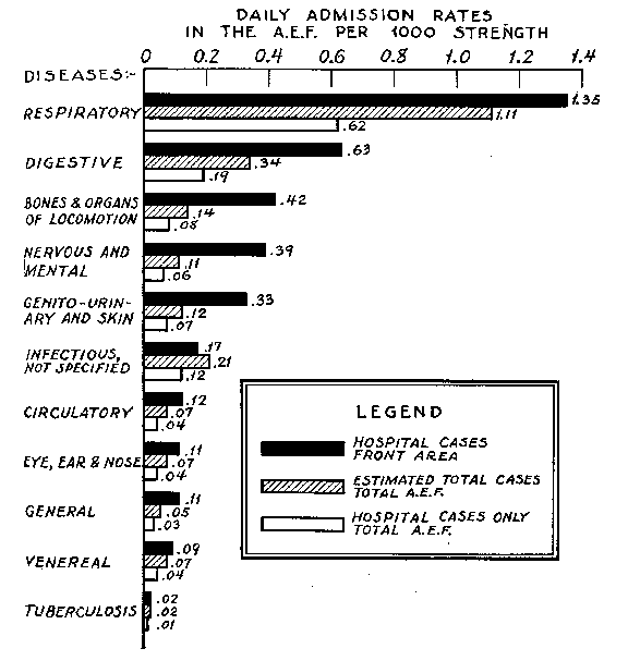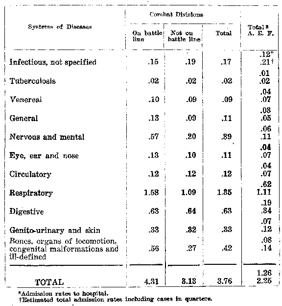 Daily admission rates from disease by systems among each 1000 white enlisted men on battle line, among troops in combat divisions, and in the total American Expeditionary Forces, June to October, 1918 |