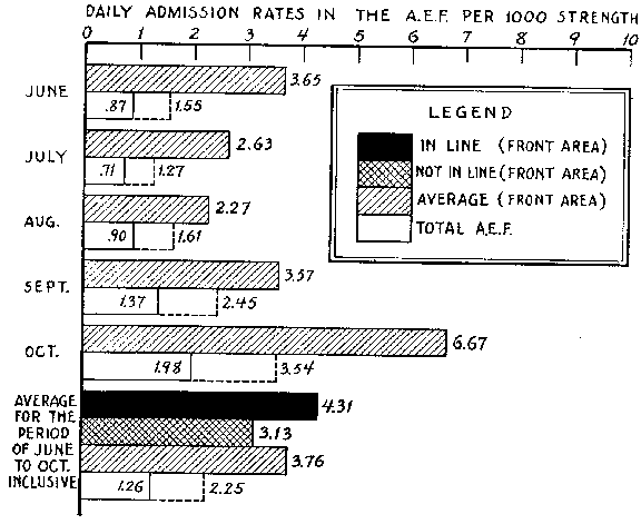Daily admission rates by classes of diseases per 1,000 strength of white troops in the front area, and also in the total American Expeditionary Forces, for the period from June I to October 31, 1918. |