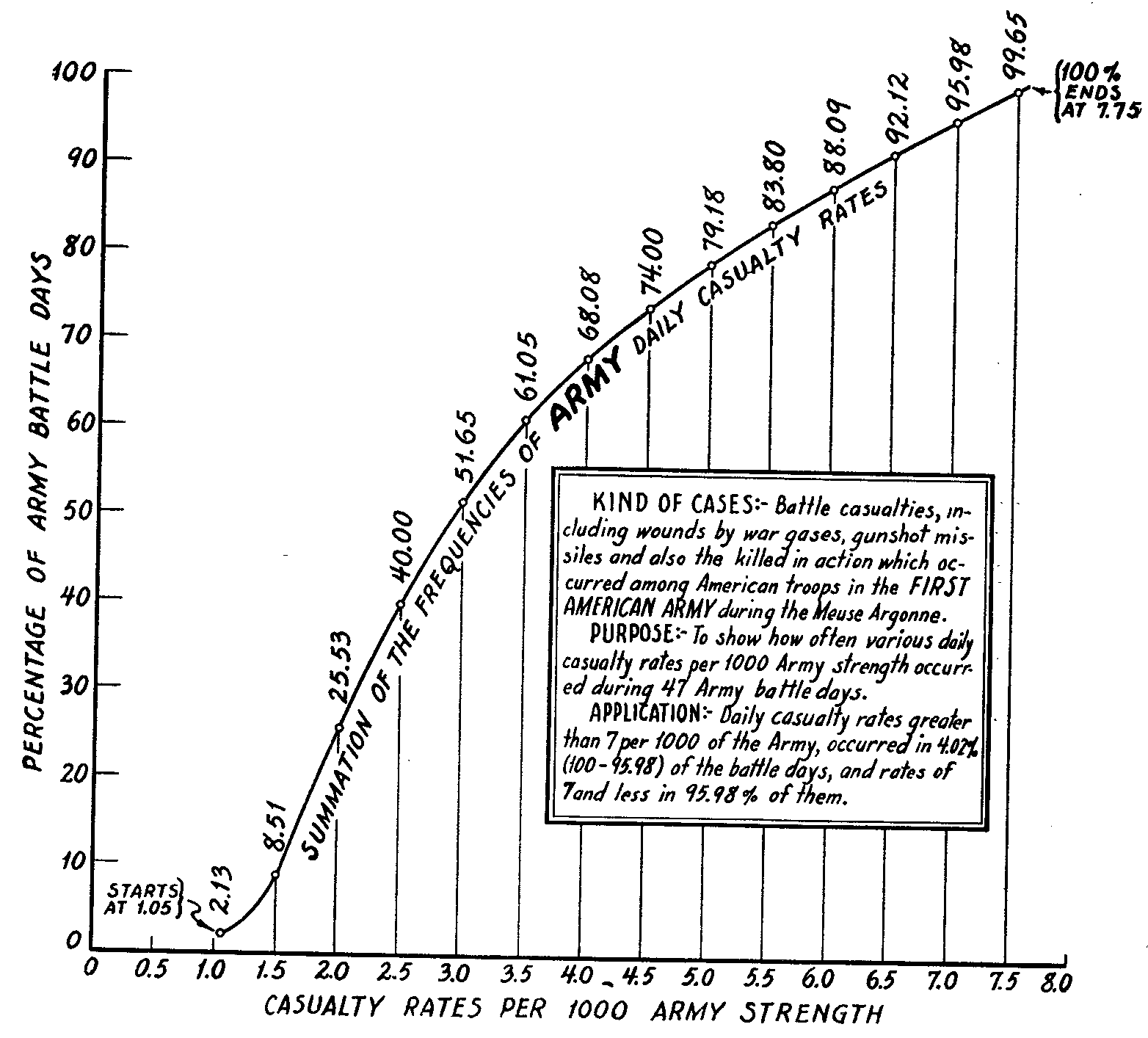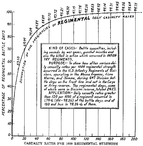 Summation curve showing how often various regimental daily casualty rates occurred during major operations in the American Expeditionary Forces in 1918. |