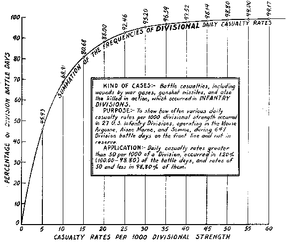 Summation curve showing how often various divisional daily casualty rates occurred during major operations in the American Expeditionary Forces in 1918. |