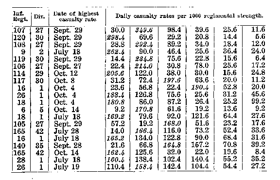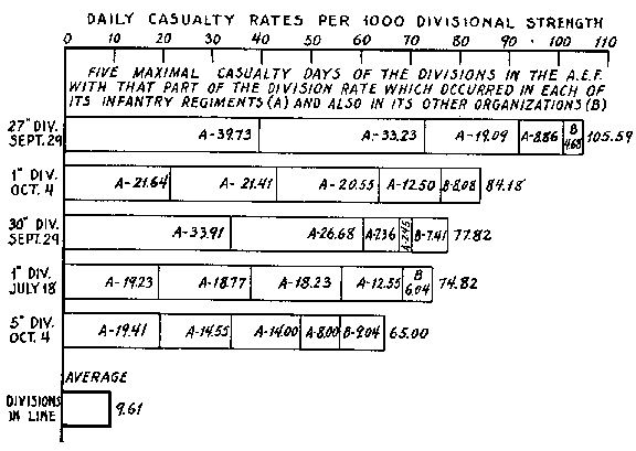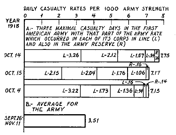 The daily casualty rates on the three maximal casualty days for the First American Army in the Meuse-Argonne Sept. 26 to Nov. 11, and also the average daily casualty rate during the same period. |