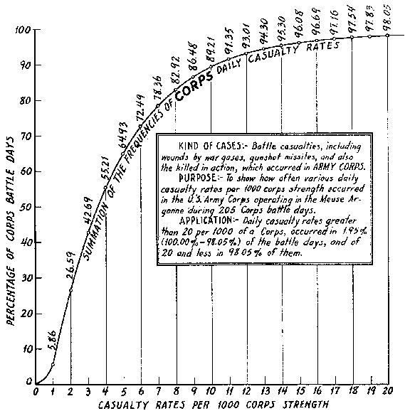Summation curve showing how often various Corps daily casualty rates occurred in the five Corps of the First American Army, including the divisions with the French as a Corps, during the Meuse-Argonne Operation, Sept. 26 to Nov. 11, 1918. |