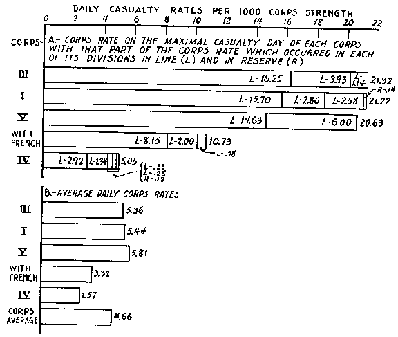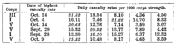 The maximal daily casualty rate for each Corps of the First American Army during the Meuse-Argonne Sept. 26 to Nov. 11, 1918, and also the average rate for each one during the entire period a. |